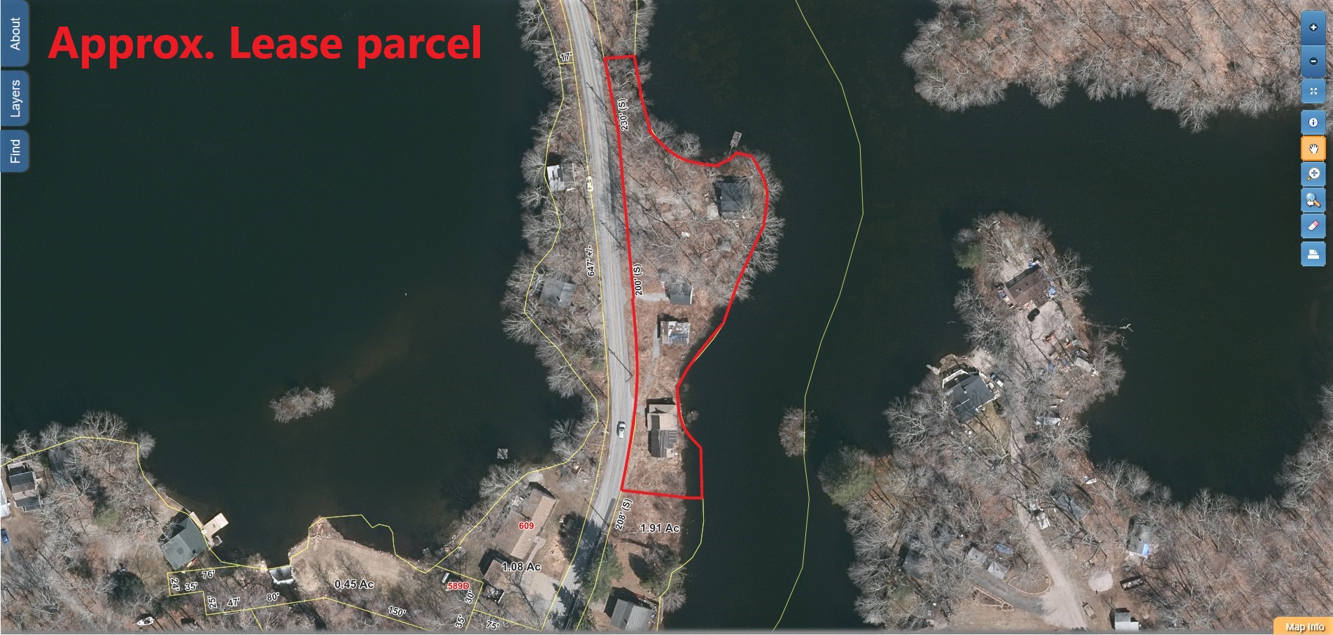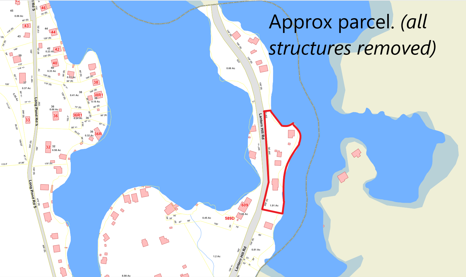 Mr. and Mrs. Graham would like to give/gift about 550 linear feet of the pond frontage to the Town, which was the middle section of the pond. Because Ledge Light Health District required a certain amount of reserve area for the remaining cottages on the parcel (one cottage on the south side and three cottages on the north side) that the property could not be divided to give a portion of the parcel to the Town.